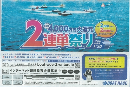 ¥Ü¡¼¥È¥ì¡¼¥¹¿¶¶½²ñ¤Ç¤Ï£··î£±¡Á£³£±Æü¤Ë¥¤¥ó¥¿¡¼¥Í¥Ã¥È¡¦ÅÅÏÃÅêɼ²ñ°÷¤òÂоݤˡÖÁí³Û£´£°£°£°Ëü±ßÂç´Ô¸µ¡¡£²Ï¢Ã±º×¤ê¡×¤ò¼Â»Ü¡£¤½¤Î£Ð£ÒÂ⤬£²£¸Æü¡¢Åìµþ¡¦±ÛÃæÅç¤Î¥¹¥Ý¡¼¥Ä¥Ë¥Ã¥Ý¥ó¿·Ê¹¼Ò¤òˬ¤ì¤¿¡£¥¥ã¥ó¥Ú¡¼¥ó´ü´ÖÃæ¤ËÆÃÀߥµ¥¤¥È¤«¤éÅÐÏ¿¤ò¹Ô¤¤¡¢¥¤¥ó¥¿¡¼¥Í¥Ã¥È¡¦ÅÅÏÃÅêɼ¤Ç£²Ï¢Ã±½®·ô¤ò£²£°£°£°±ß°Ê¾å¹ØÆþ¤¹¤ë¤È±þÊç¤Ç¤¤ë¡£±þÊç¼Ô¤ÎÃæ¤«¤éÃêÁª¤Ç£²£°£°£°¿Í¤Ë£²Ëü±ß¤ò¥¥ã¥Ã¥·¥å¥Ð¥Ã¥¯¡£ÃêÁª¤Ï£··î£±£µÆü¡¢£¸·î£³Æü¤Î£²²ó¹Ô¤ï¤ì¤ëͽÄê¡£